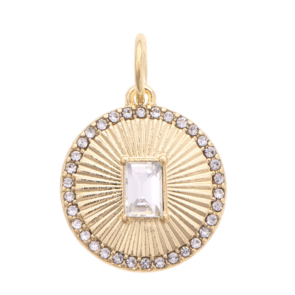 This sparkling coin charm in shiny gold delivers a luxe, vintage-inspired vibe. Its pave rhinestones add a touch of glamour to any chain.