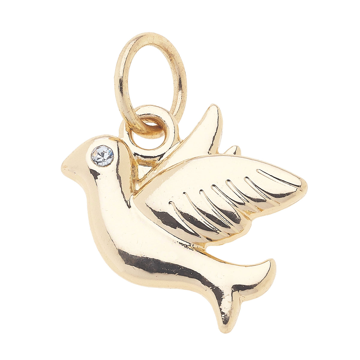 The Dove Bird Charm in Shiny Gold features a delicate dove in polished gold. This charm symbolizes peace and love, making it a meaningful and serene addition to your jewelry.