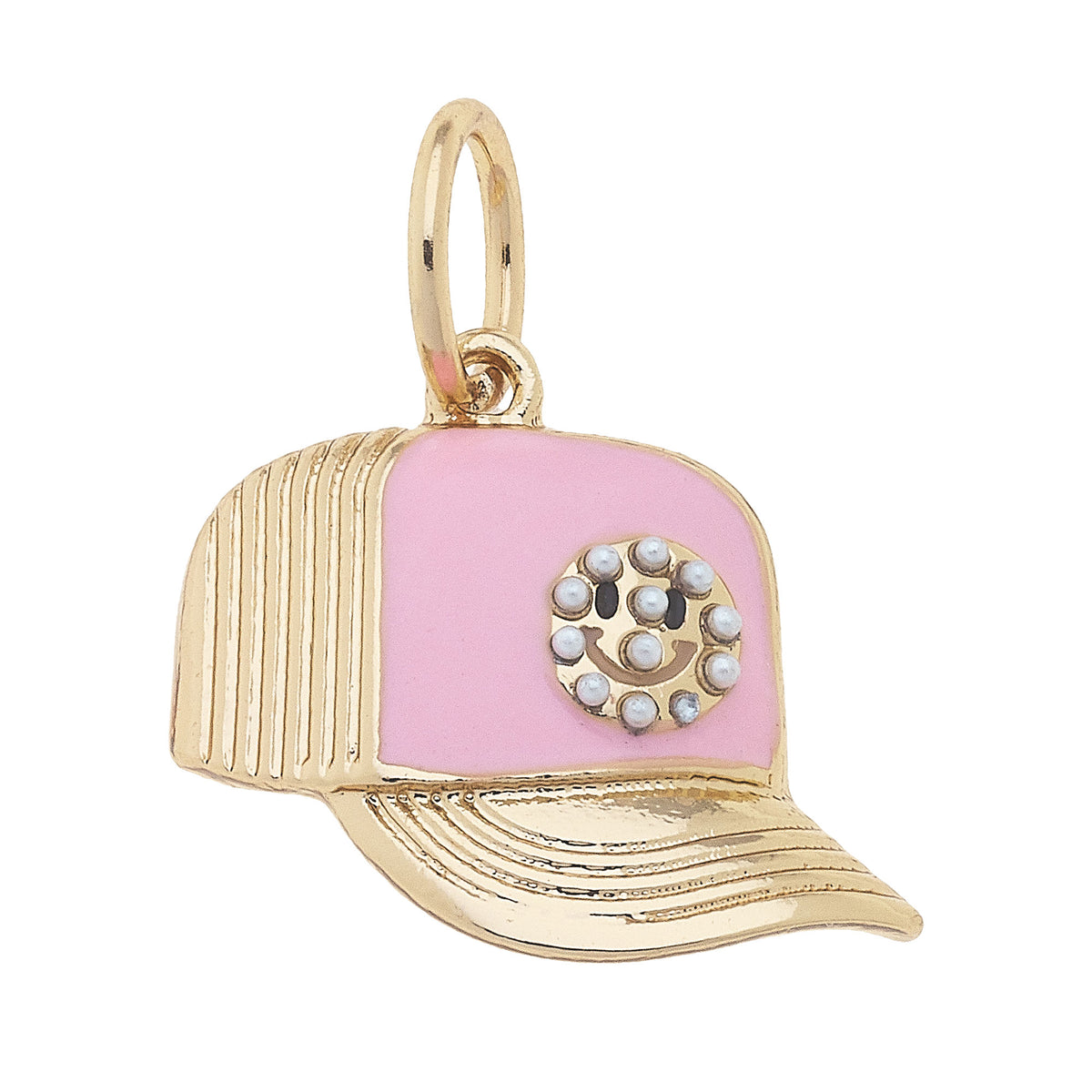 The Smiley Face Trucker Hat Charm in Light Pink features a light pink trucker hat with a happy smiley face. This charm adds a fun and casual vibe to your accessory collection.