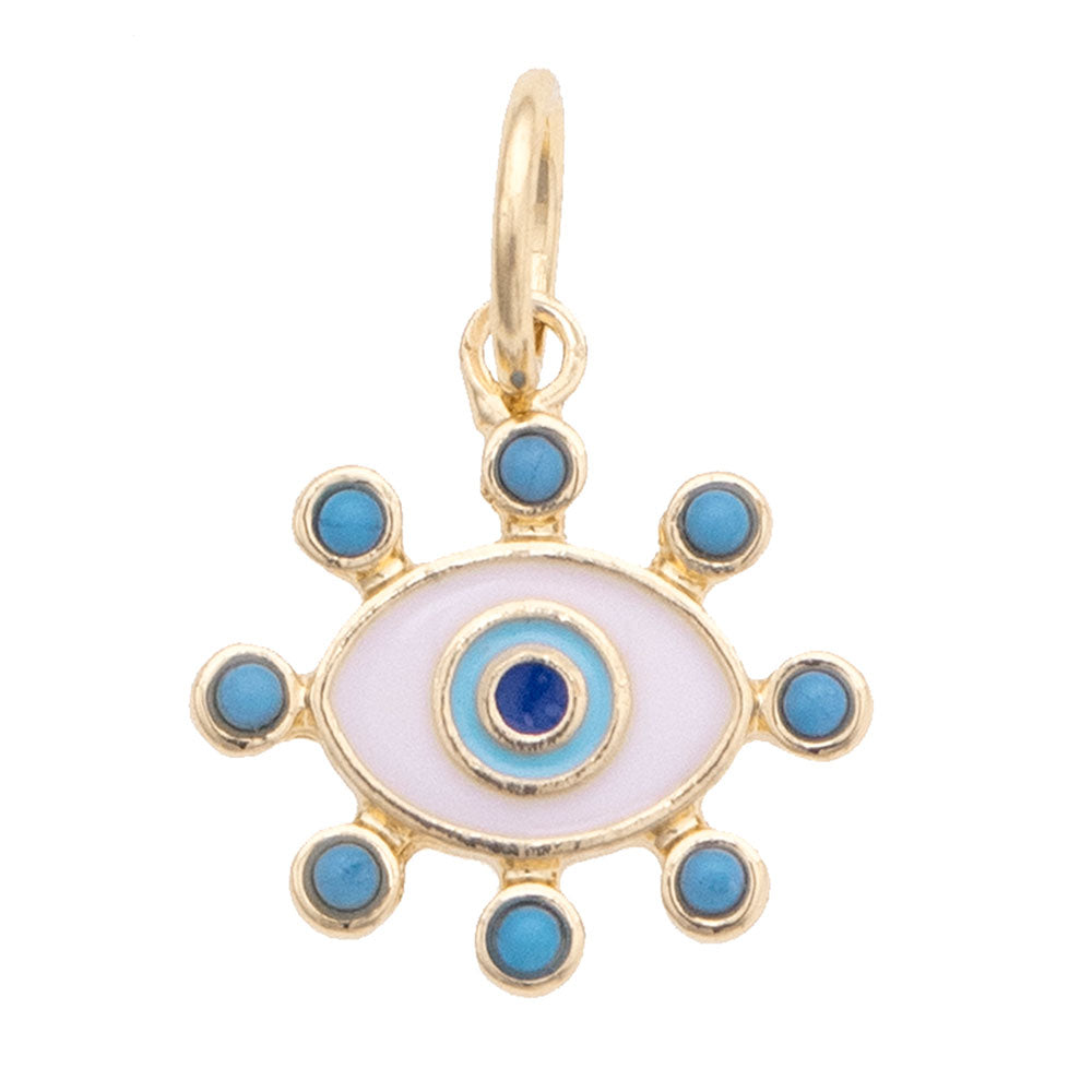 This bold evil eye charm features studded details and a shiny gold finish. A stylish way to bring edge and meaning to your look.