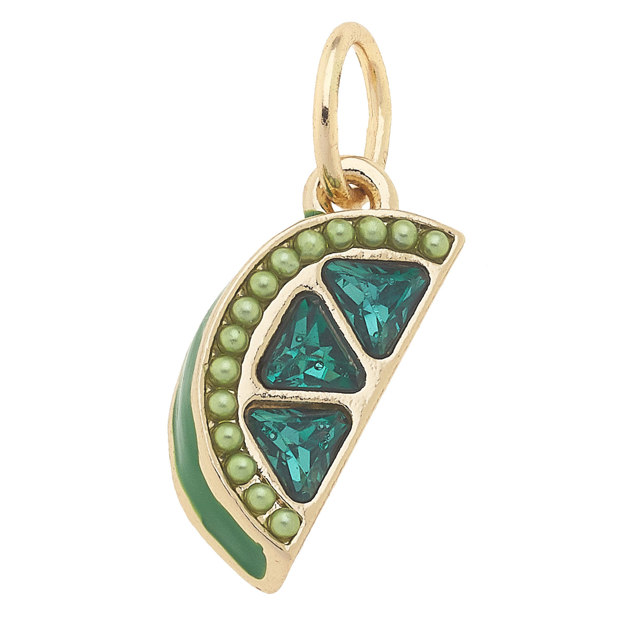 The Pave Lime Wedge Charm in Green features a lime wedge design with pave stone detailing. This charm adds a zesty, vibrant touch to your jewelry collection.