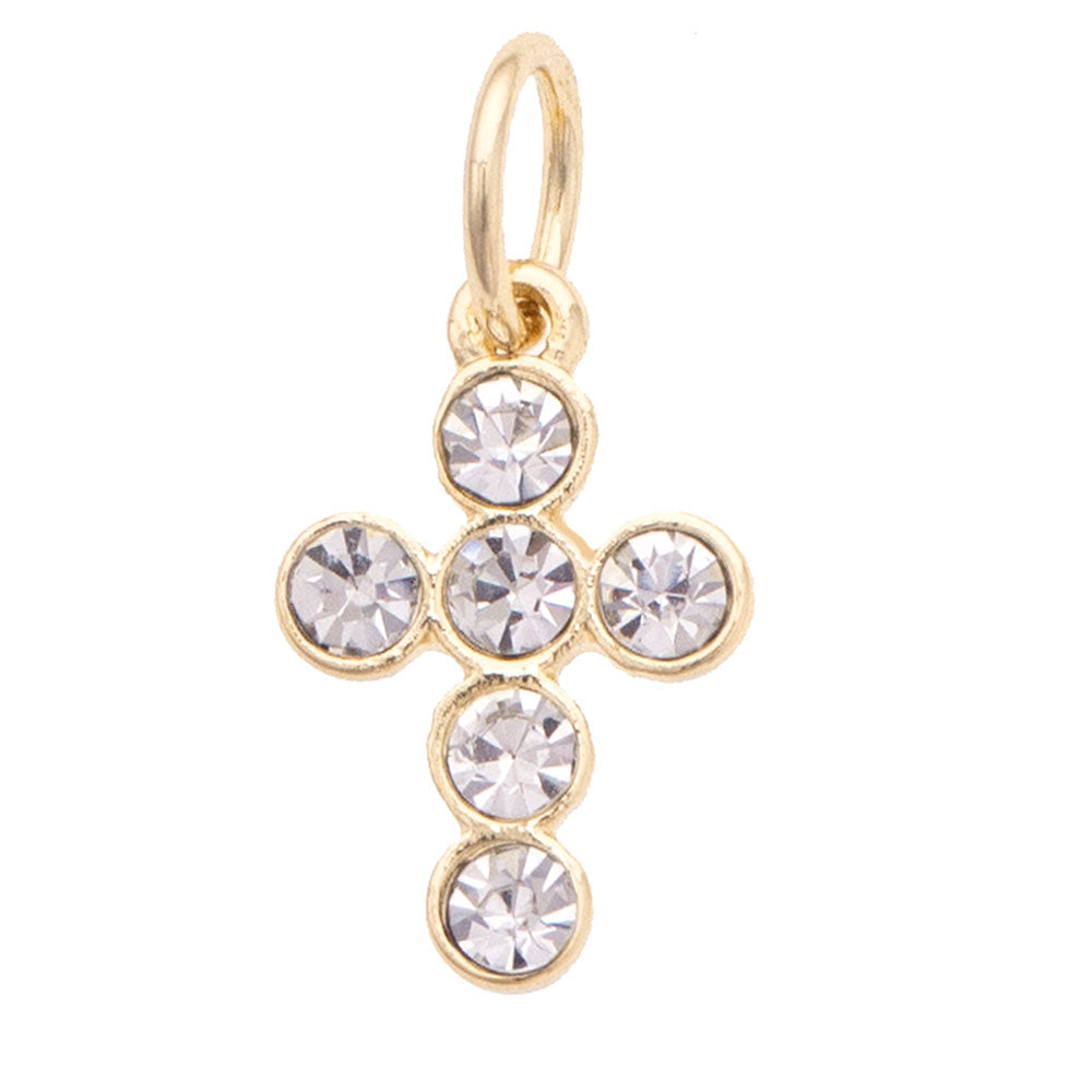 Sparkle with faith in this rhinestone-studded cross charm in shiny gold. Its delicate shine makes it a timeless addition to your jewelry.