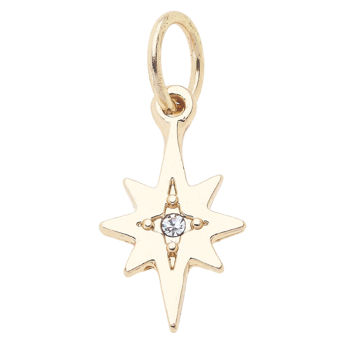 The Rhinestone Starburst Charm in Shiny Gold features a radiant starburst design encrusted with rhinestones. This charm adds a glamorous, celestial touch to any jewelry collection.