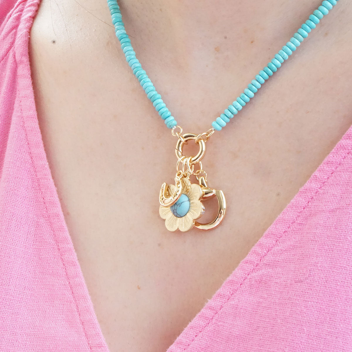 Evoking the beauty of the desert, the Turquoise Southwestern Flower Charm brings a pop of color and touch of boho elegance to your jewelry. Show off your unique style by mixing and matching this charm with others and adding it to a charm necklace or bracelet (sold separately).