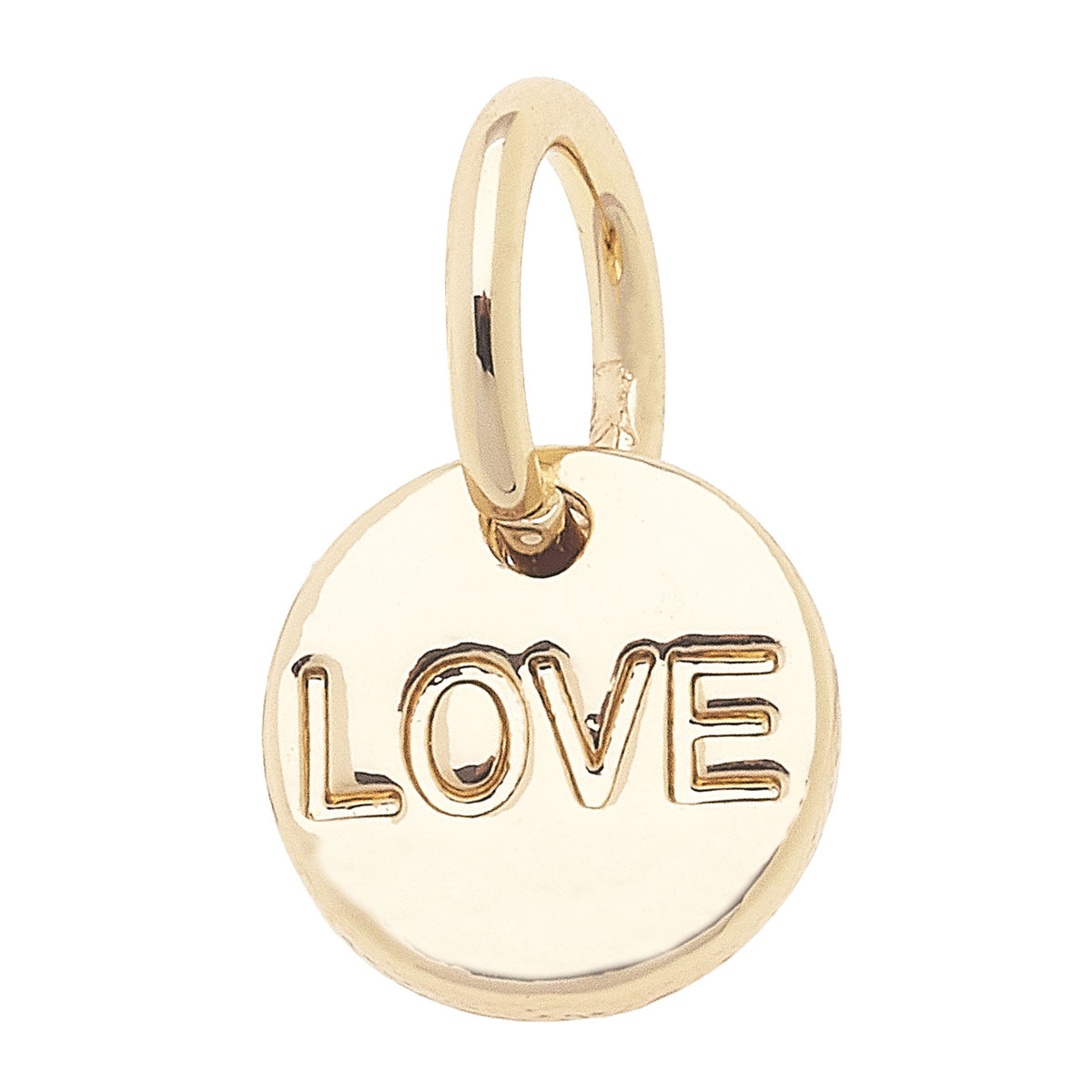 The LOVE Mini Disc Charm in Shiny Gold features the word "LOVE" engraved on a polished gold disc. This charm adds a romantic and meaningful touch to any jewelry piece.